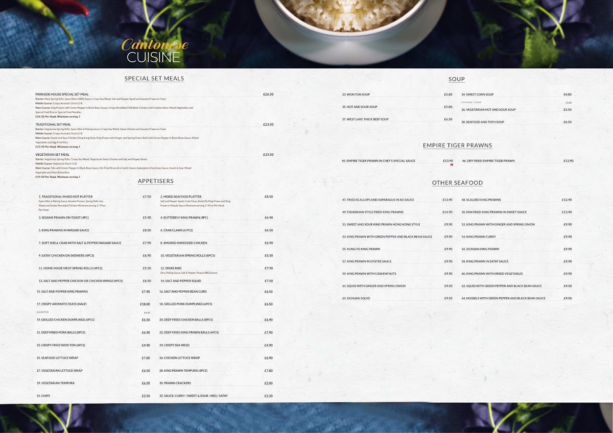 The menu at Parkside Restaurant reflects a balanced blend of traditional Chinese flavors and approachable dishes suited for both dine-in and takeaway. It offers a variety of comforting options ranging from classic starters like spring rolls and wonton soup to more substantial mains such as Szechuan roast pork, cashew chicken, and Singapore-style noodles. Alongside these, there are thoughtfully prepared vegetarian and seafood choices, ensuring a satisfying experience for diverse tastes.